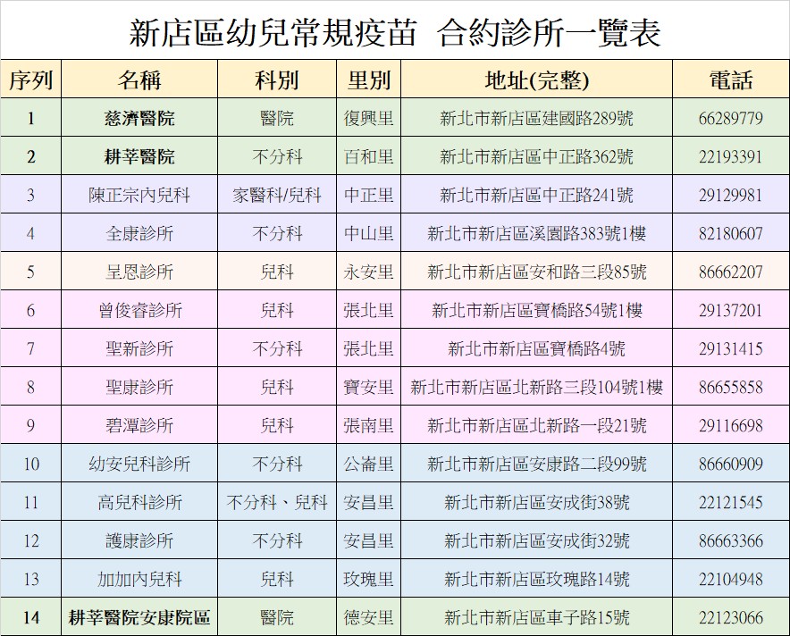 新店區衛生所公費幼兒常規疫苗接種須知: