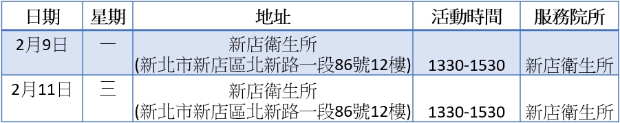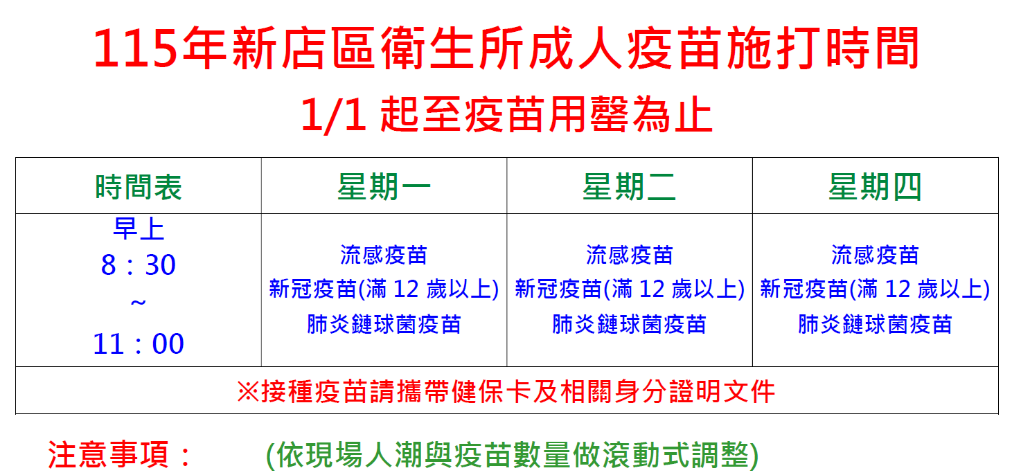 新店衛生所於每周二上午8:30-11:00提供Novavax JN.1、12歲以下Moderna LP.8.1