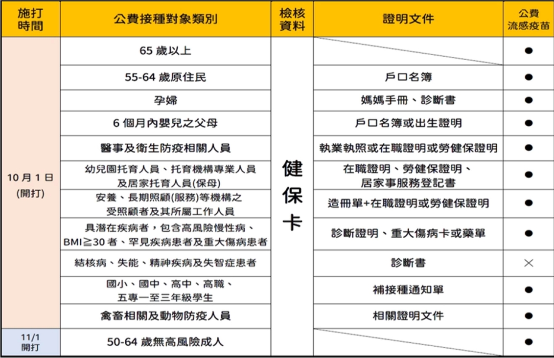 2.符合公費接種對象請於上述時間攜帶健保卡+佐證資料。